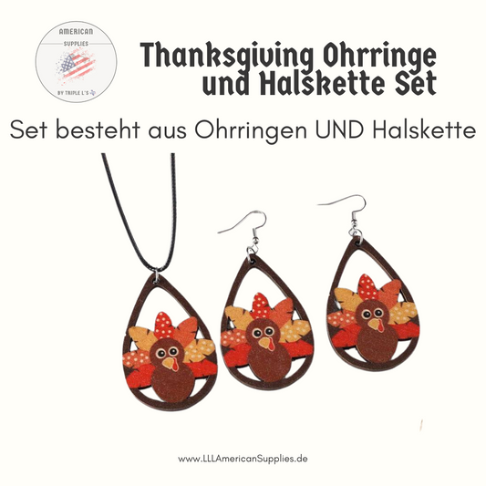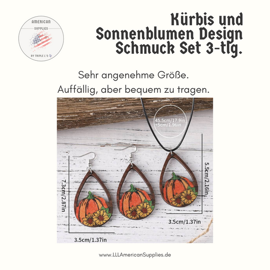 Thanksgiving Schmuckset – 3-teilig mit Kürbis- und Sonnenblumen-Design, Holzanhänger und Ohrringe